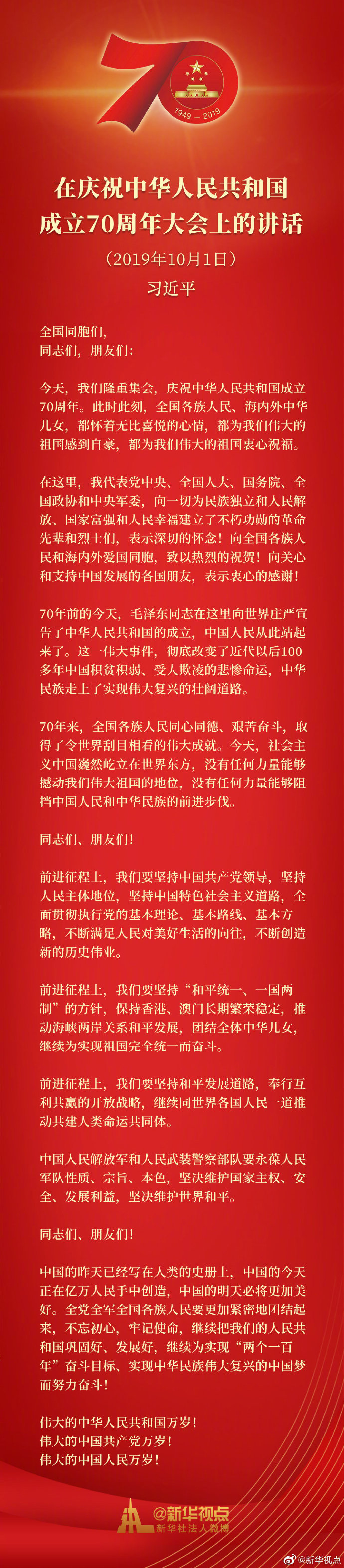 习近平:在庆祝中华人民共和国成立70周年大会上的讲话
